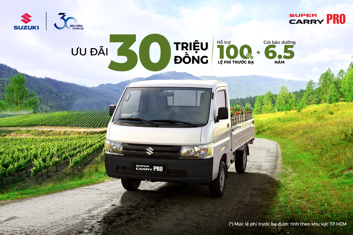 Nhằm mang lại những quyền lợi đặc biệt cho khách hàng, Việt Nam Suzuki triển khai chương trình ưu đãi hấp dẫn trên toàn quốc trong tháng 11/2025 (*). Theo đó, khách hàng mua dòng xe thương mại Suzuki Carry Pro sẽ được hỗ trợ tương đương 100% lệ phí trước bạ và Gói bảo dưỡng xe lên đến 6,5 năm, tổng ưu đãi lên đến 30 triệu.